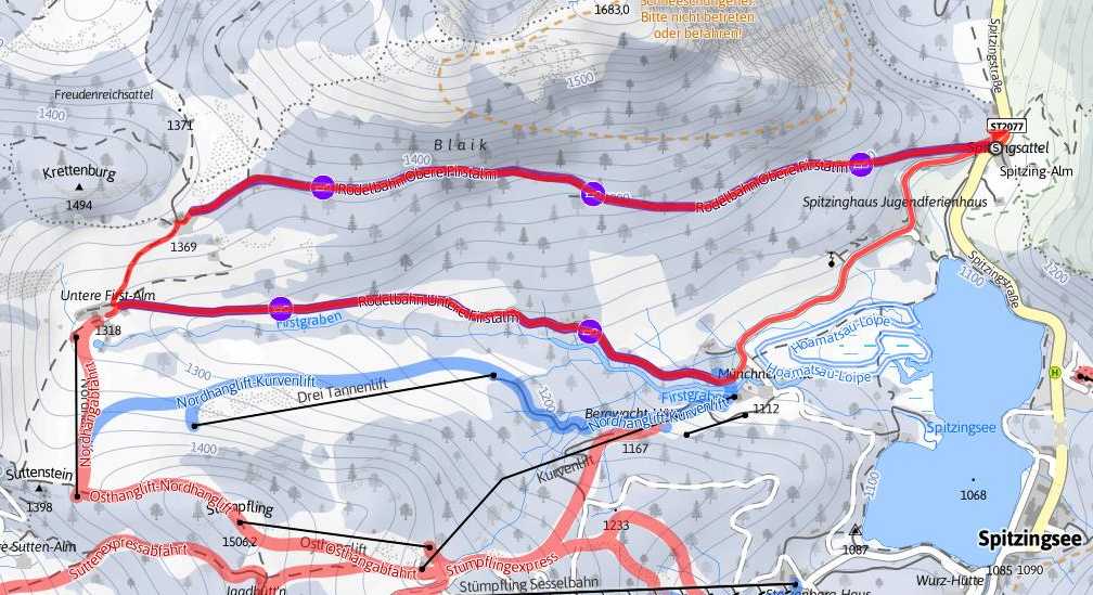 Unsere Rodeltour beginnt am Spitzingsattel auf 1129 Meter. Von dort gehen wir in westlicher Richtung entlang des Spitzingsees zum Kurvenlift Parkplatz. Vom Parkplatz folgen wir der Beschilderung mäßig ansteigend binnen 1 Stunde entlang des Firstgrabens zur Unteren Firstalm.
